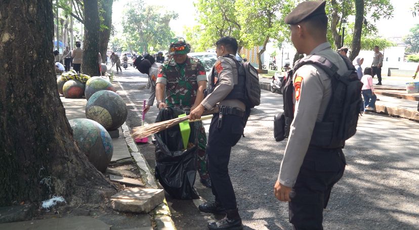 Kegiatan bersih-bersih ini melibatkan personel Polres Tasikmalaya Kota, unsur TNI, jajaran Pemkot Tasikmalaya, serta elemen masyarakat sebagai bentuk kolaborasi dalam menjaga kenyamanan ruang publik di Kota Tasikmalaya. (Rizky Zaenal Mutaqin)