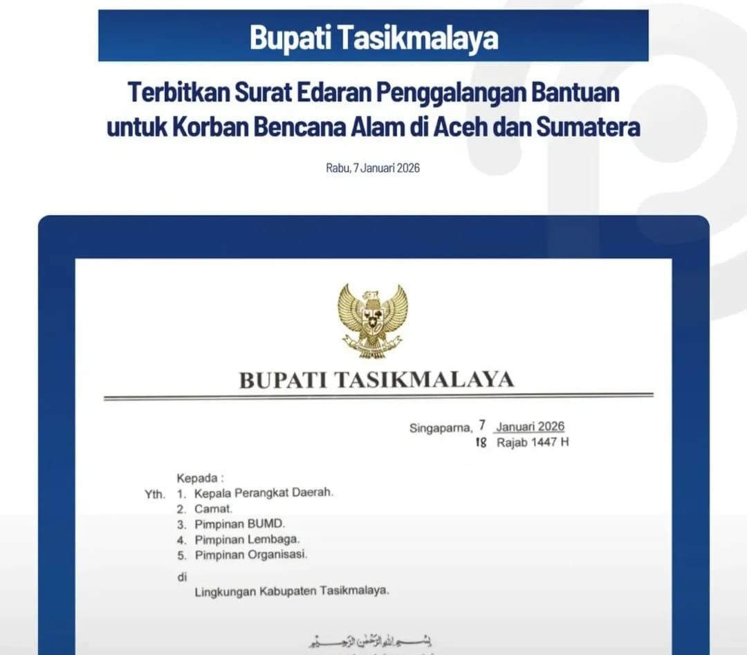 Surat edaran yang ditetapkan di Singaparna pada 7 Januari 2026 itu merupakan tindak lanjut dari Keputusan Bupati Tasikmalaya Nomor 400.9.10/Kep.609-DinasSosialPPKBP3A/2025 tentang pembentukan Tim Solidaritas Sosial Bencana Alam Aceh dan Sumatera di wilayah Kabupaten Tasikmalaya.