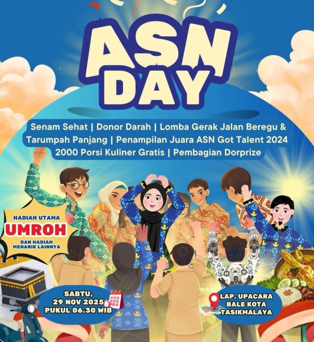 TASIKMALAYA — Pemerintah Kota Tasikmalaya kembali menggelar ASN Day 2025 dalam rangka memperingati HUT ke-54 KORPRI tingkat Kota Tasikmalaya. Kegiatan meriah ini akan berlangsung pada Sabtu, 29 November 2025 pukul 06.30 WIB di Lapangan Upacara Bale Kota Tasikmalaya.