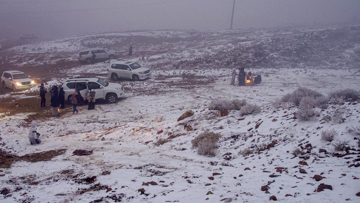 Di sejumlah titik, suhu udara bahkan tercatat turun hingga 4 derajat Celsius, sangat kontras dengan iklim gurun Arab Saudi yang umumnya panas dan kering.