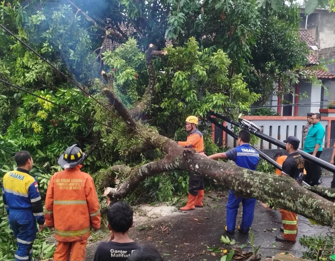 Petugas melakukan pemotongan batang pohon, pembersihan material yang menutup jalan, serta pengamanan area guna mencegah risiko lanjutan, termasuk kemungkinan gangguan jaringan listrik.