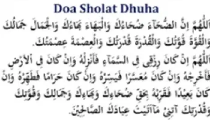 “Ya Allah, sesungguhnya waktu dhuha adalah waktu-Mu, keagungan adalah keagungan-Mu, keindahan adalah keindahan-Mu, kekuatan adalah kekuatan-Mu, dan penjagaan adalah penjagaan-Mu. Ya Allah, jika rezekiku berada di langit, turunkanlah; jika berada di bumi, keluarkanlah; jika sulit, mudahkanlah; jika haram, sucikanlah; jika jauh, dekatkanlah. Dengan kebenaran dhuha-Mu dan kekuasaan-Mu, berikanlah aku apa yang Engkau berikan kepada hamba-hamba-Mu yang shalih.”