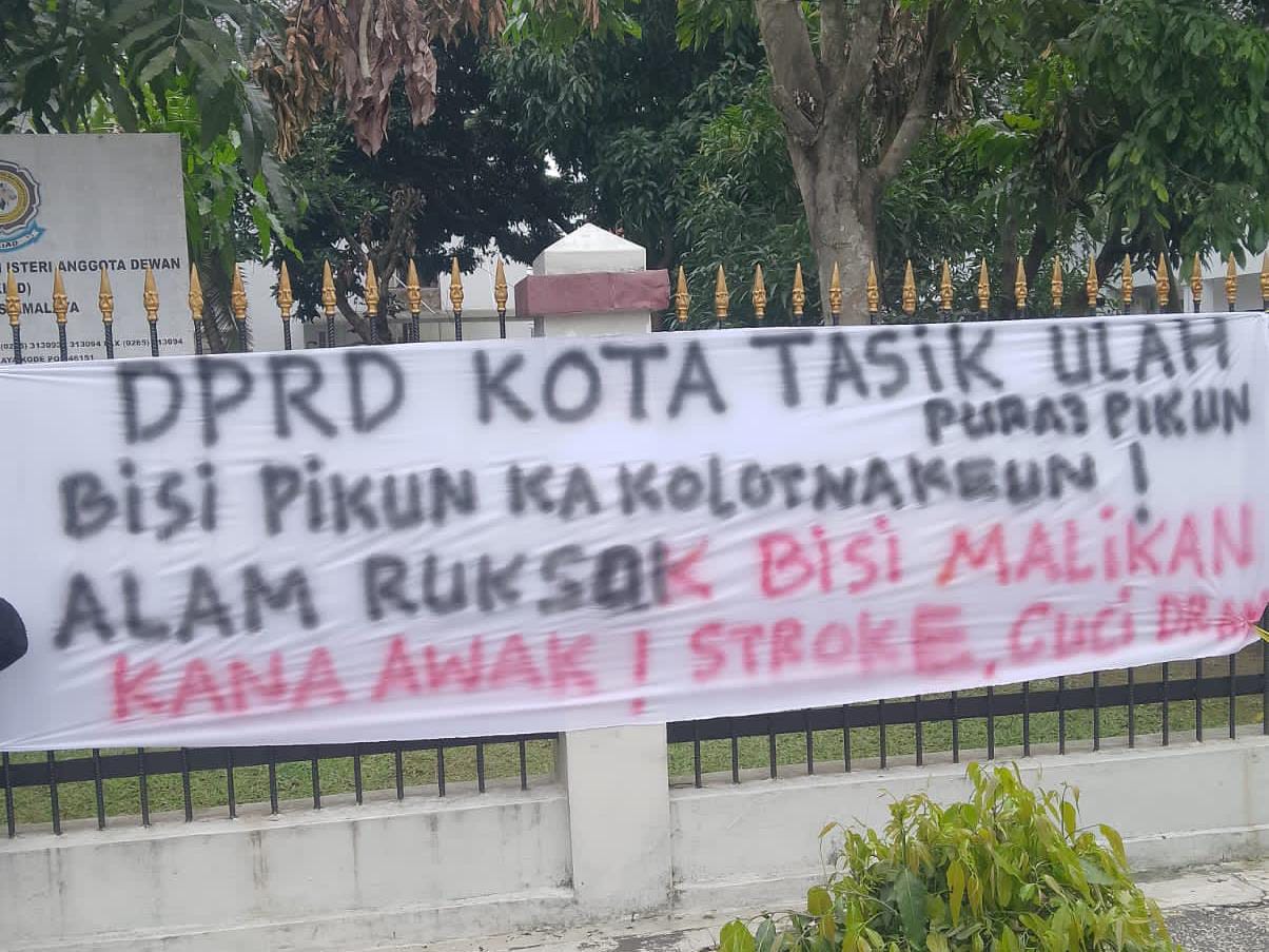 Di tembok depan Kantor DPRD Kota Tasikmalaya, KRPL menempelkan spanduk bernada keras bertuliskan: