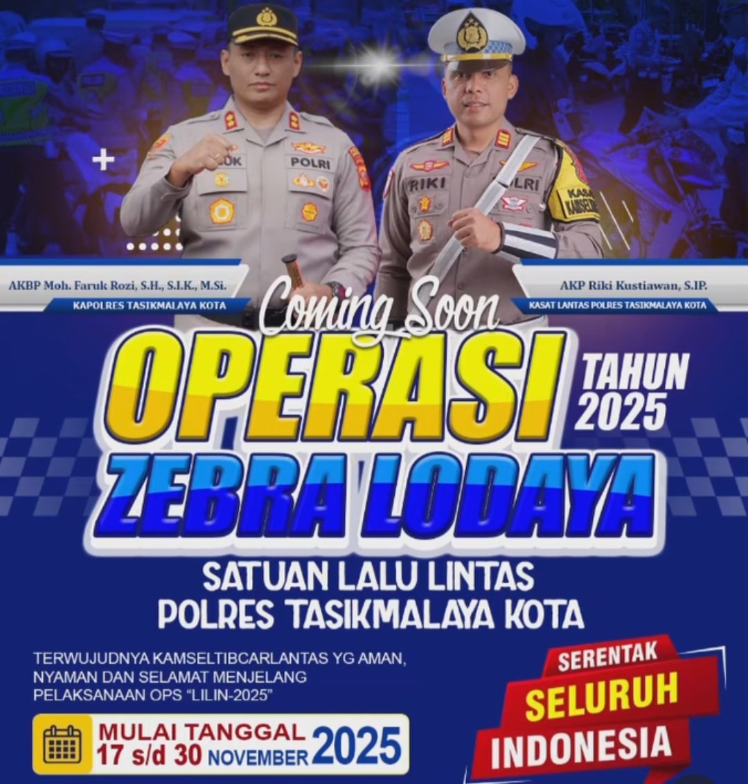 TASIKMALAYA – Polres Tasikmalaya Kota resmi mengumumkan pelaksanaan Operasi Zebra Lodaya 2025 yang akan digelar serentak di seluruh wilayah Jawa Barat. Operasi kepolisian ini dijadwalkan berlangsung mulai 17 November hingga 30 November 2025.