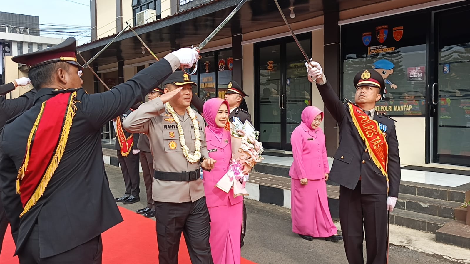 Prosesi penyambutan dipimpin Wakapolres Tasikmalaya Kompol Sukmawijaya, diawali dengan tradisi pedang pora dan pengalungan bunga sebagai simbol resmi dimulainya kepemimpinan baru di Polres Tasikmalaya.