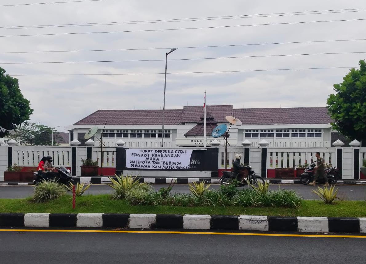 TASIKMALAYA – Kekecewaan publik terhadap sikap Pemerintah Kota Tasikmalaya kembali mencuat. Sebuah spanduk bernada protes terbentang di depan Benteng Bale Kota Tasikmalaya, Kamis (15/1/2026), bertuliskan “Turut berduka cita! Pemkot kehilangan muka! Wali Kota tak berdaya di bawah kaki mafia sungai.”
