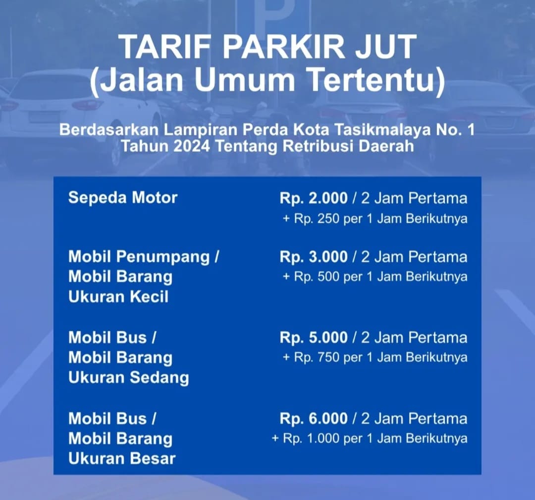Selain menekankan pentingnya karcis, pemerintah juga mengingatkan kembali tarif parkir Jalan Umum Tertentu (JUT) sesuai Perda Kota Tasikmalaya No. 1 Tahun 2024 tentang Retribusi Daerah.