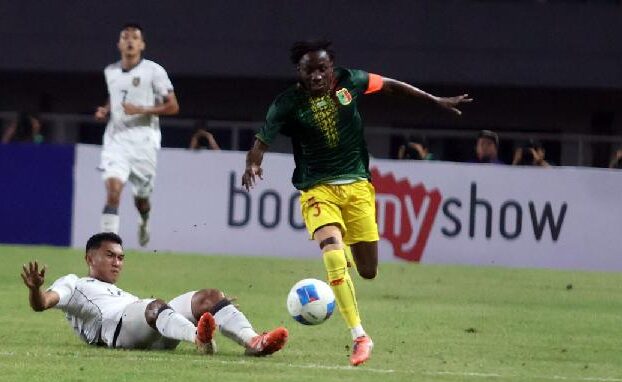 Justru Mali yang berhasil mencuri keunggulan lebih dulu. Pada menit ke-12, Sekou Kone memanfaatkan kelengahan lini belakang Indonesia setelah menerima umpan tarik dari sisi kanan dan menaklukkan kiper Daffa Fasya. Gol tersebut membuat Mali unggul 1-0 dan mengubah tempo permainan.