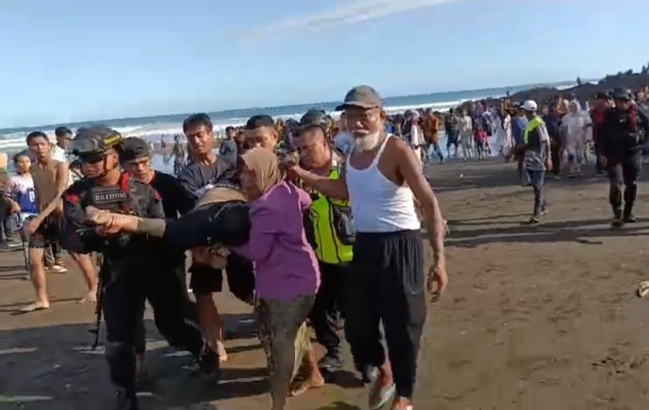 Korban diketahui berusaha menyelamatkan seorang anak bernama Panji Raspati (7), pelajar asal Cianjur, yang terseret ombak saat berenang.