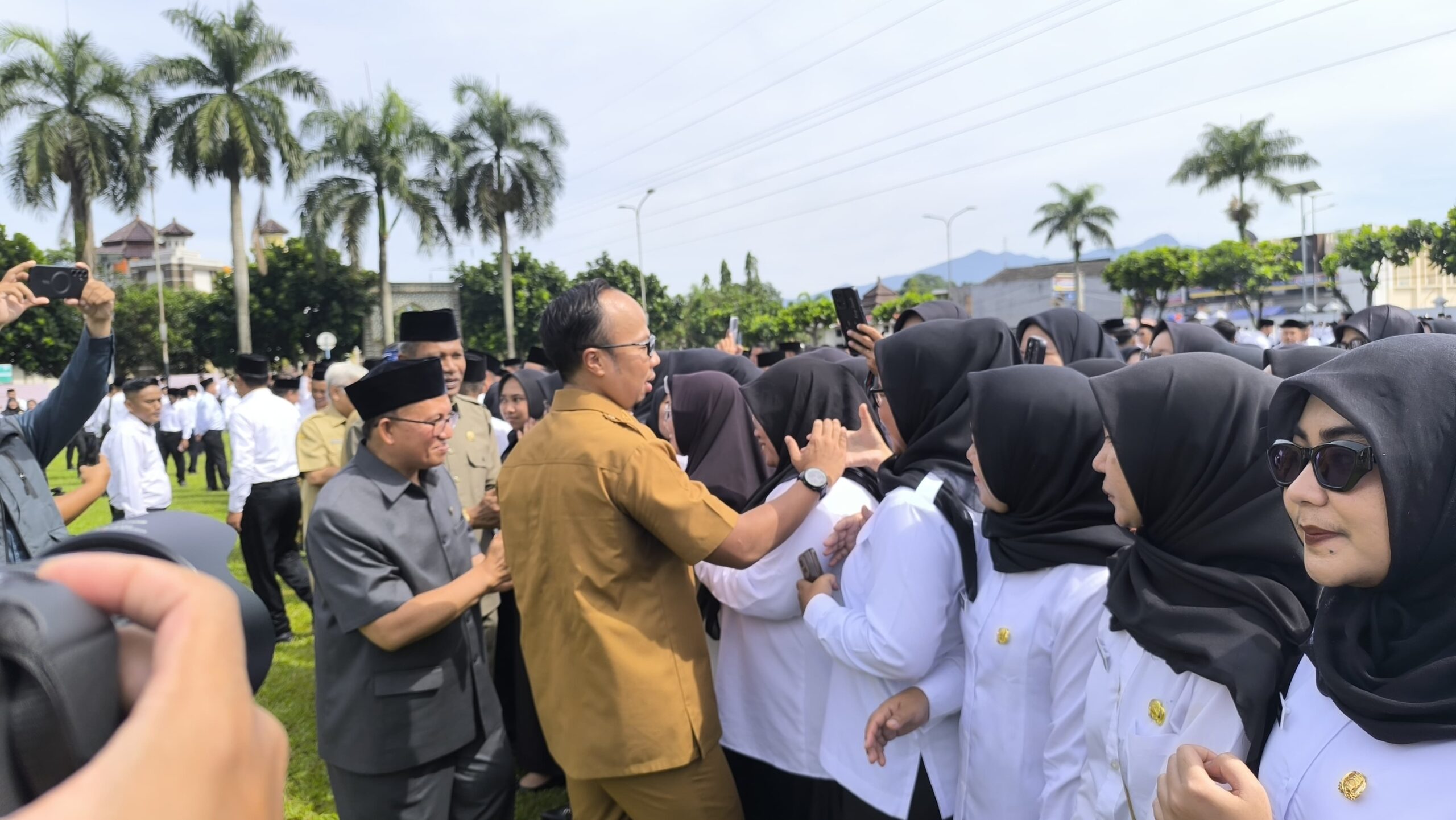 Ribuan PPPK paruh waktu tampak antusias. Mereka bahkan menyanyikan yel-yel sebagai bentuk rasa syukur dan apresiasi atas peningkatan status kepegawaiannya. Suasana semakin meriah saat Wali Kota Viman diarak oleh perwakilan PPPK menuju tengah lapangan dan disambut sorakan ribuan peserta.